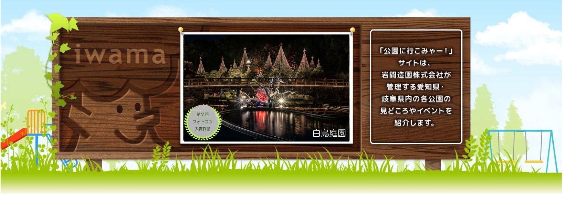 「公園に行こみゃー!」は、岩間造園株式会社が管理運営を行なっている愛知県内の公園の情報サイトです。