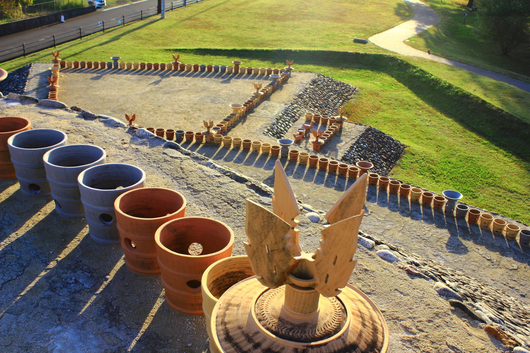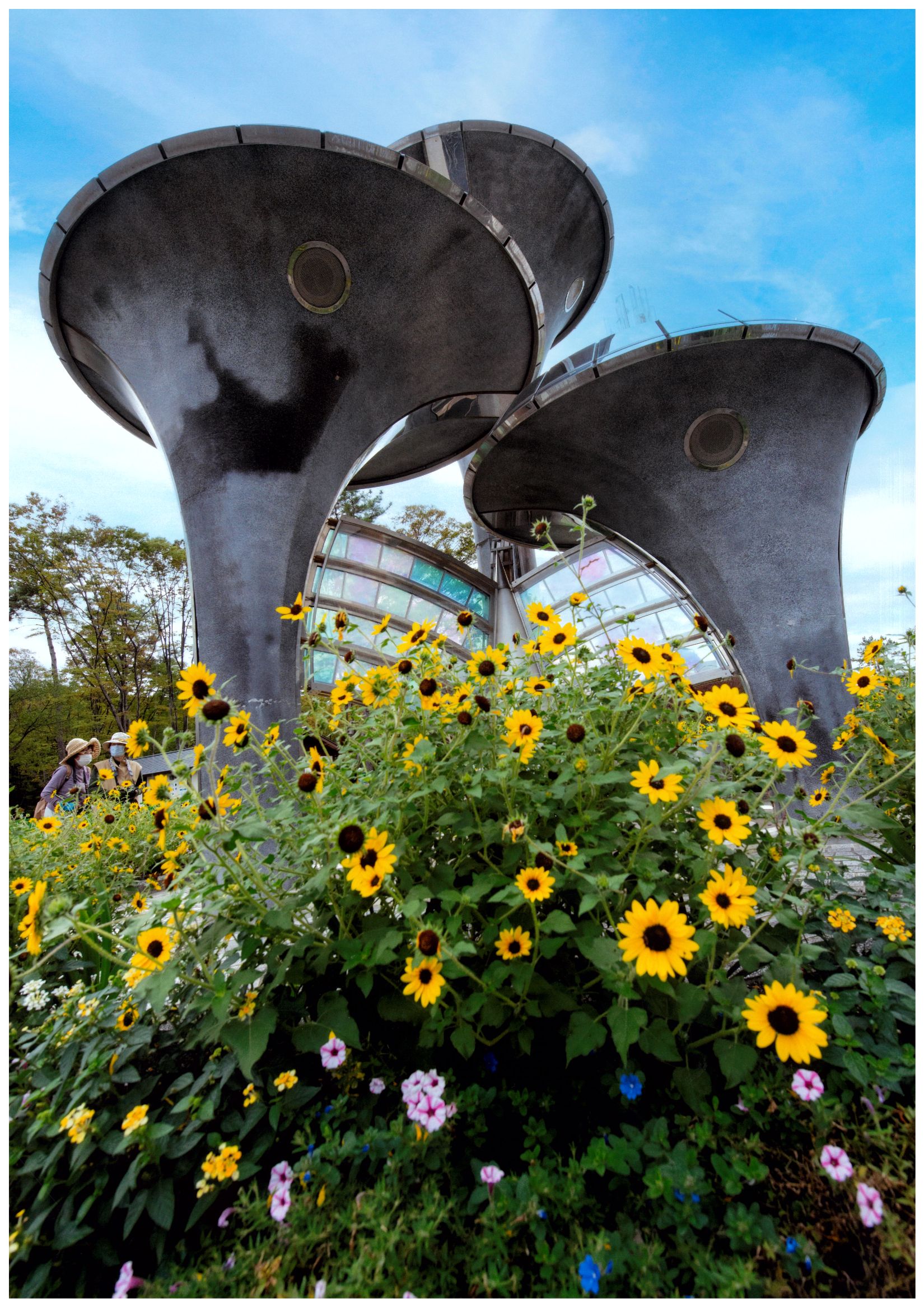 撮影者コメント:沢山の花に囲まれて個性的なモニュメントが輝いていた。