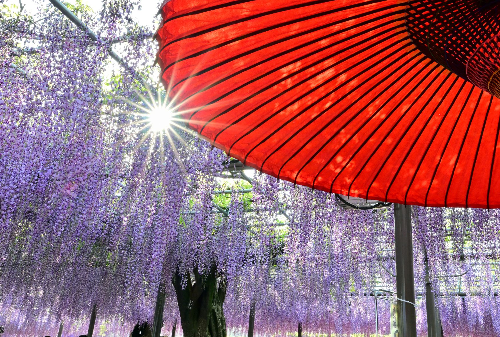 撮影者コメント:藤まつりの野立ての座席から見上げた藤棚の景色。日差しが清々しかった。