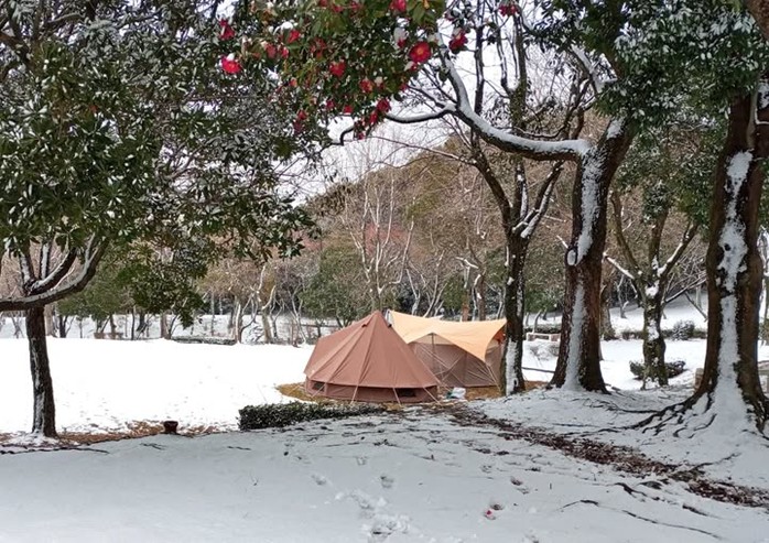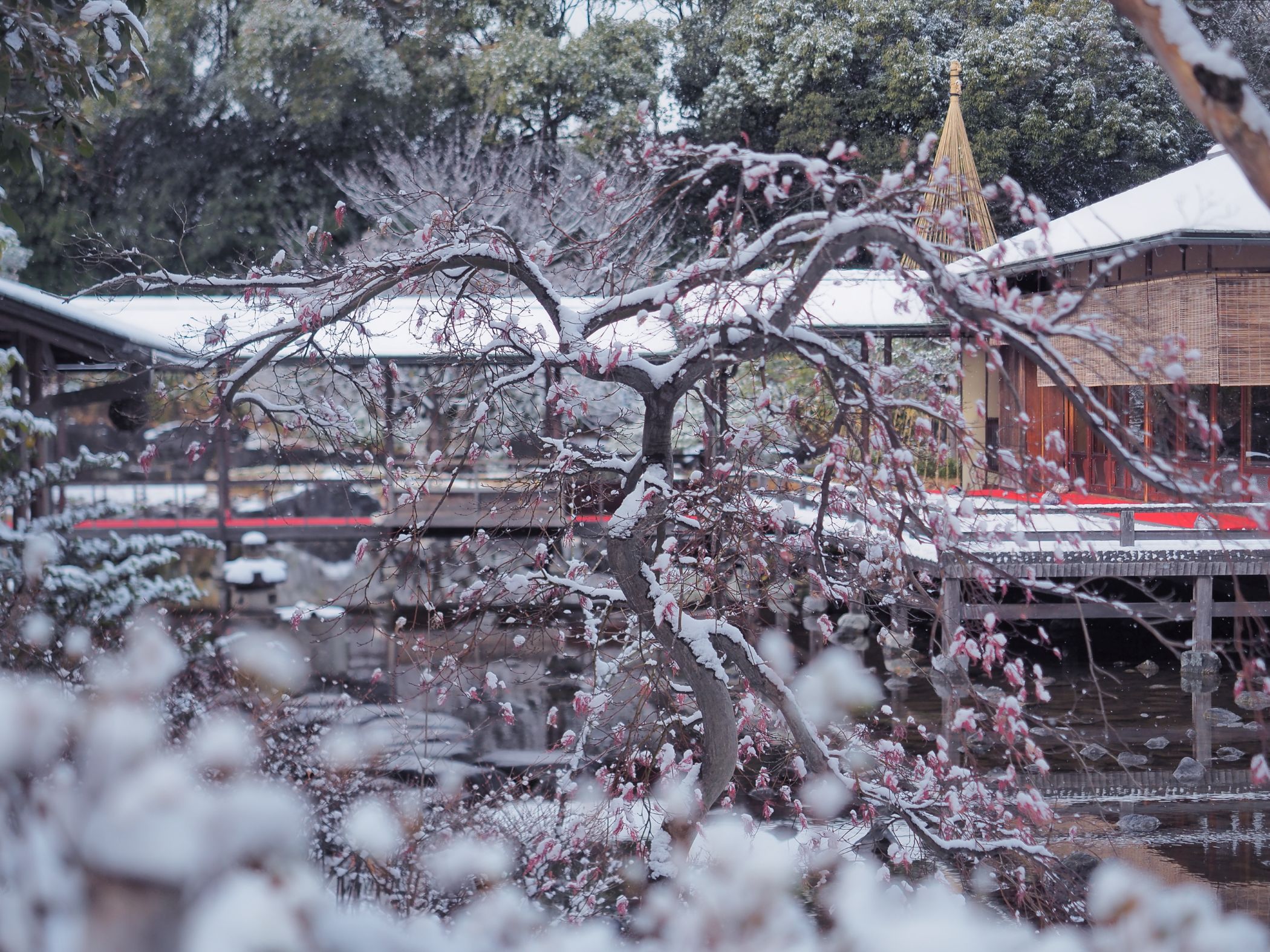 撮影者コメント:雪の日の白鳥庭園で、清羽亭を背景に着雪した樹木と雪を前ボケで撮影しました。