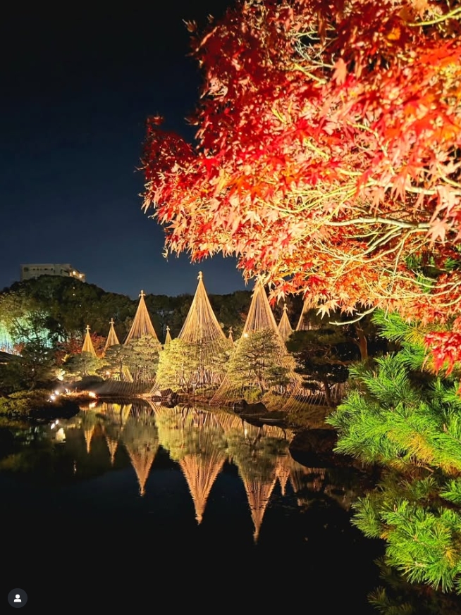 撮影者コメント:ライトアップされた紅葉を初めて見ました。池に映る紅葉と雪吊りが鏡のように鮮やかで幻想的な世界に吸い込まれてしまう様な景色でした。