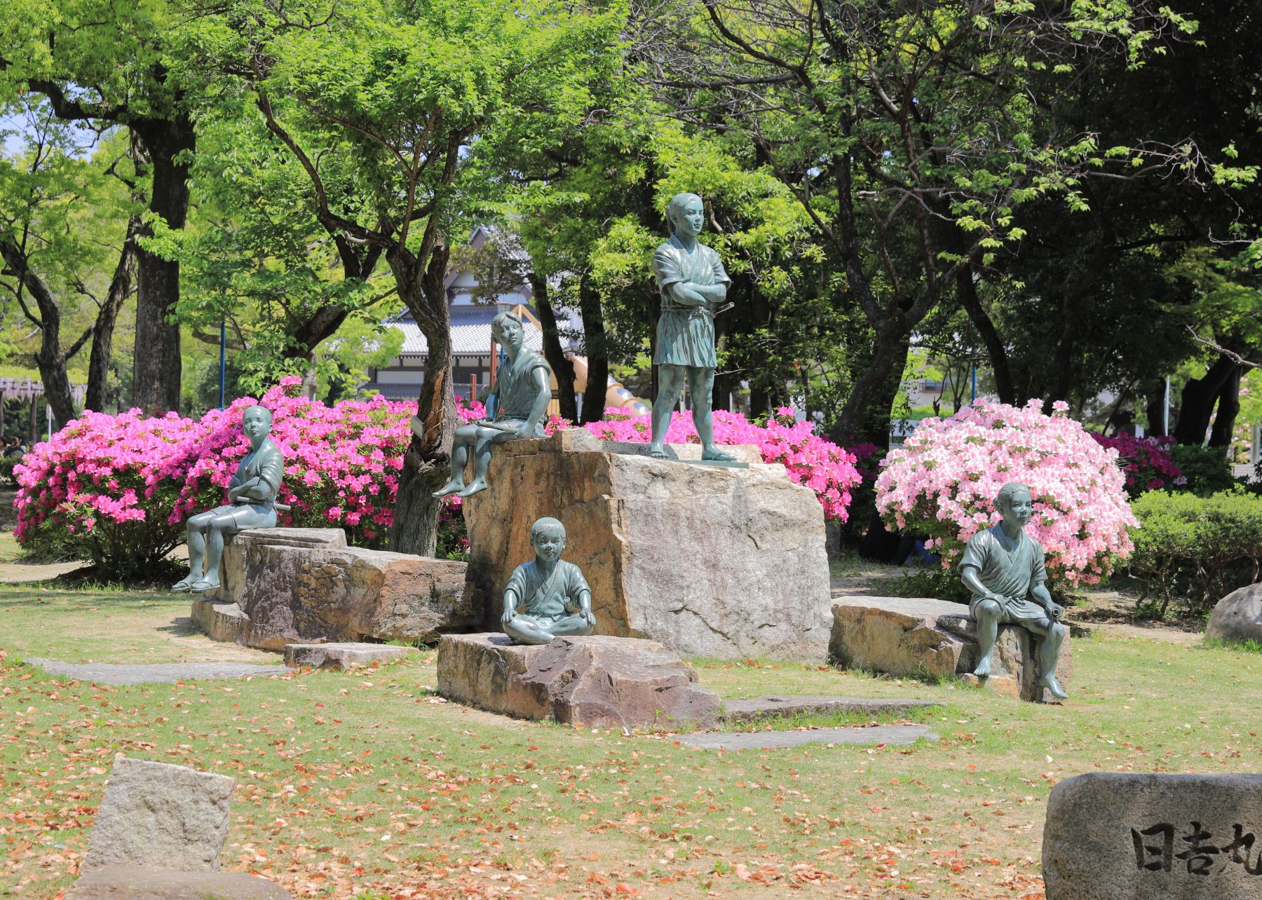 撮影者コメント:日吉丸となかまたち像の背後に満開のツツジが咲き誇り、像に花を添えています。