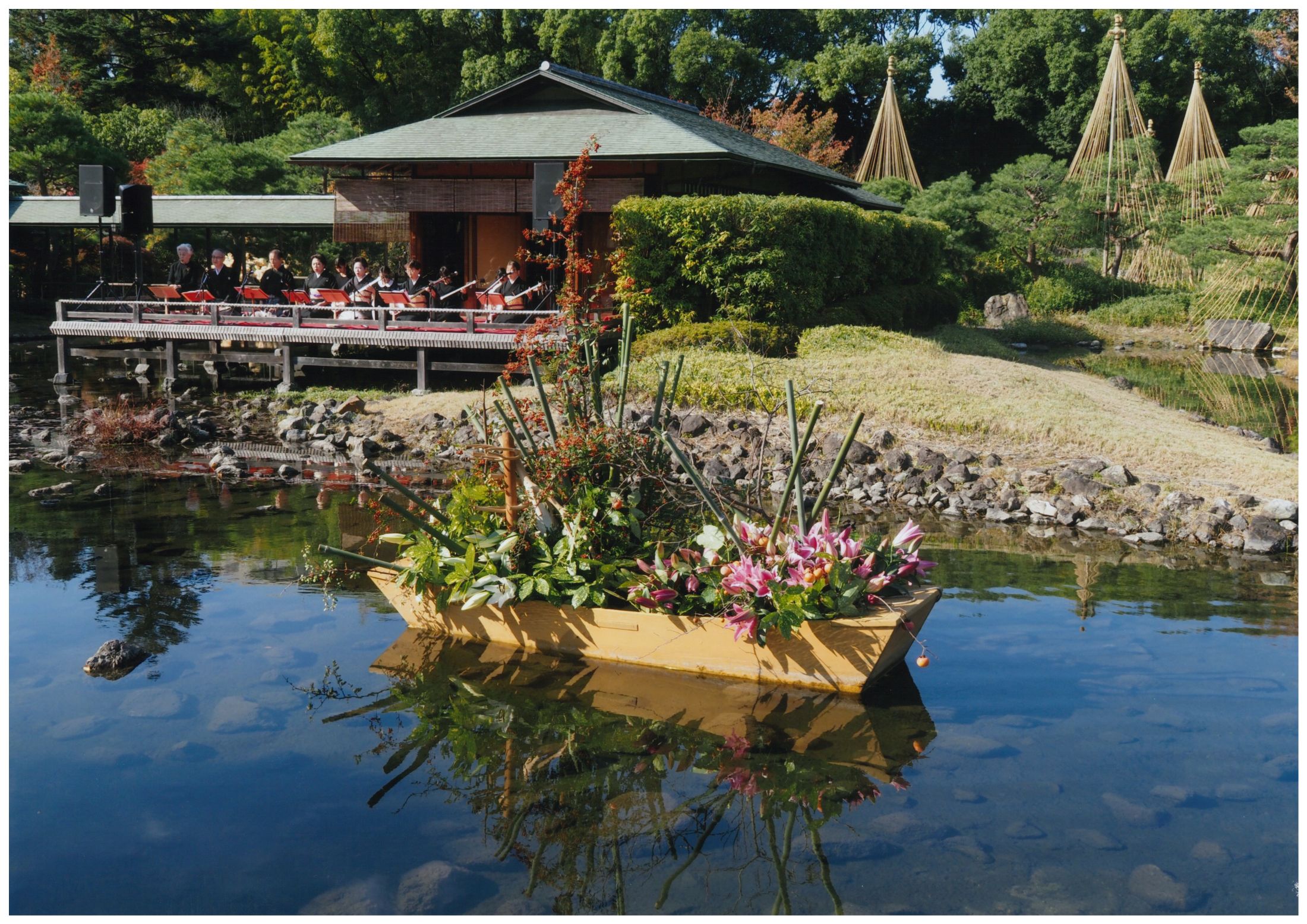 撮影者コメント:雪吊りと演奏会をバックに池の舟生花